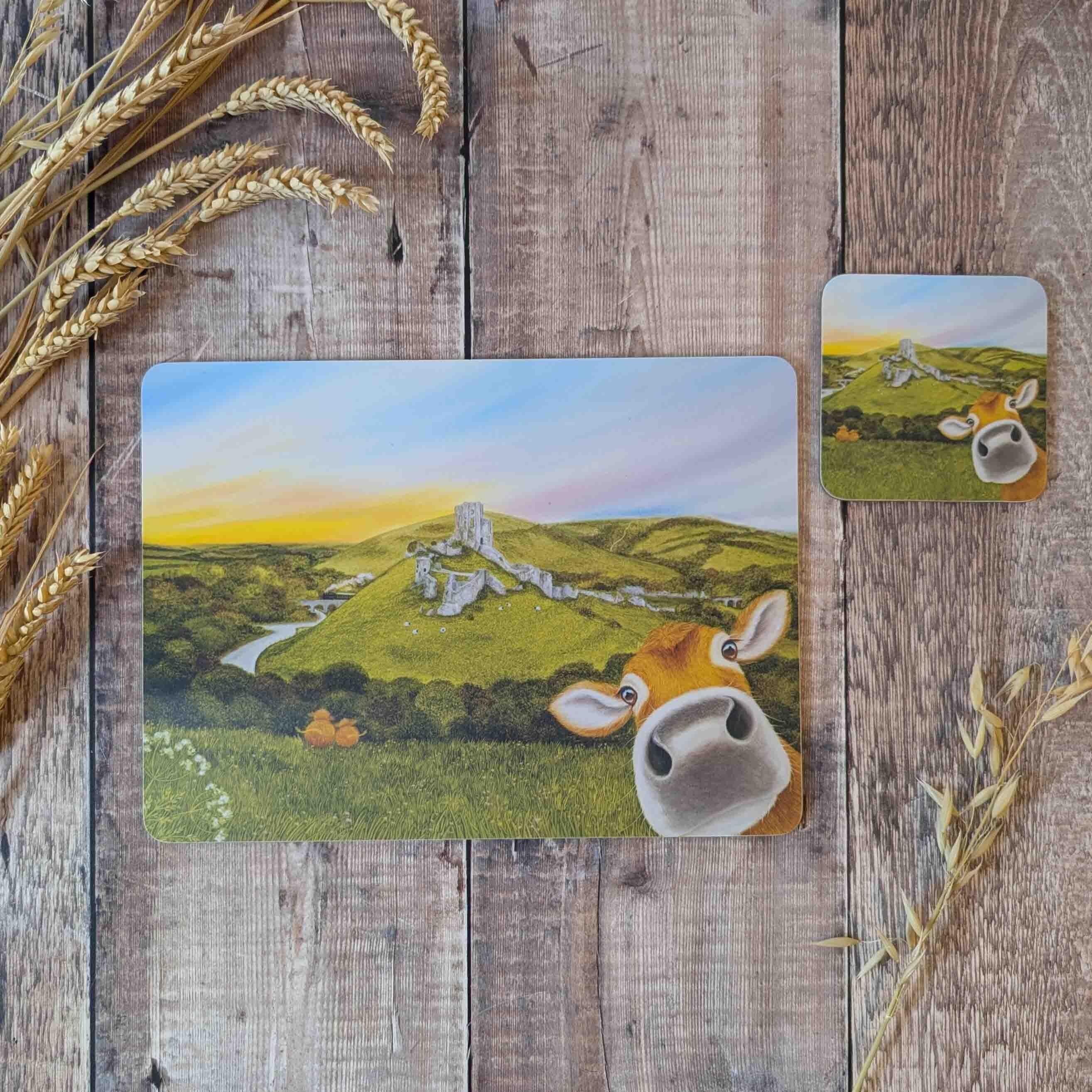 1 x Moo Selfie and the Herd at Corfe Castle placemat & coaster