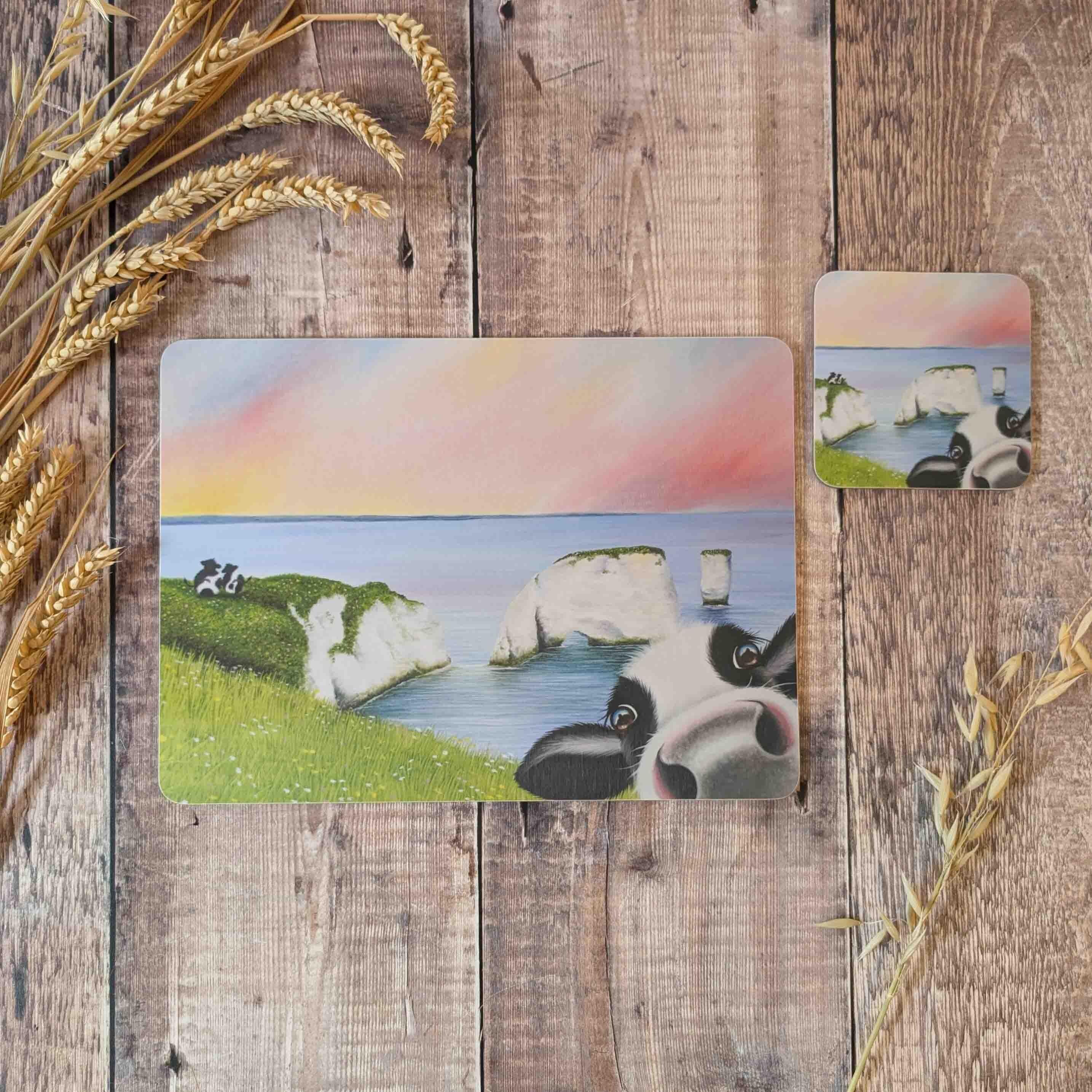 1 x Moo Selfie and the Herd at Old Harry placemat & coaster