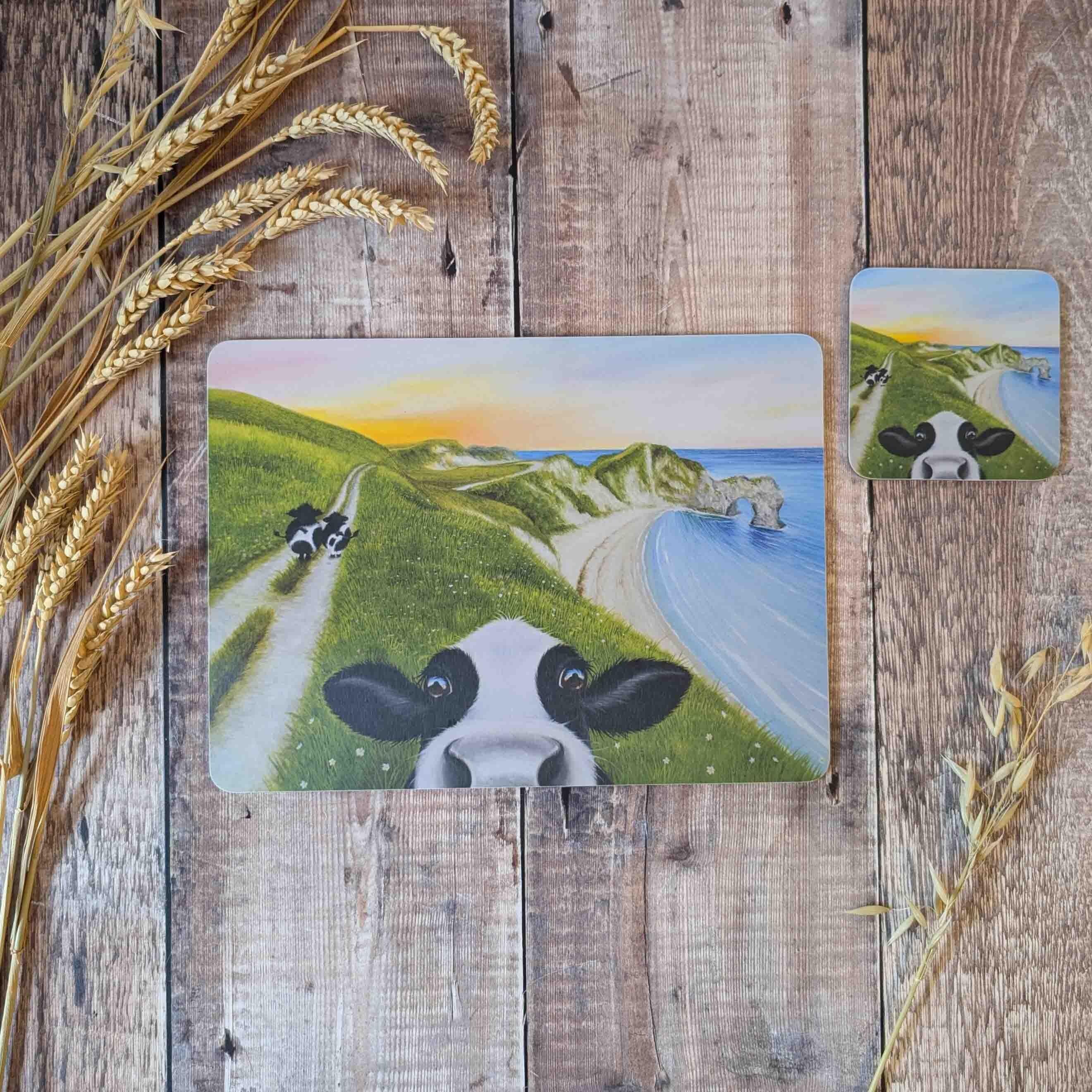 1 x Moo Selfie and the Herd at Durdle Door placemat & coaster